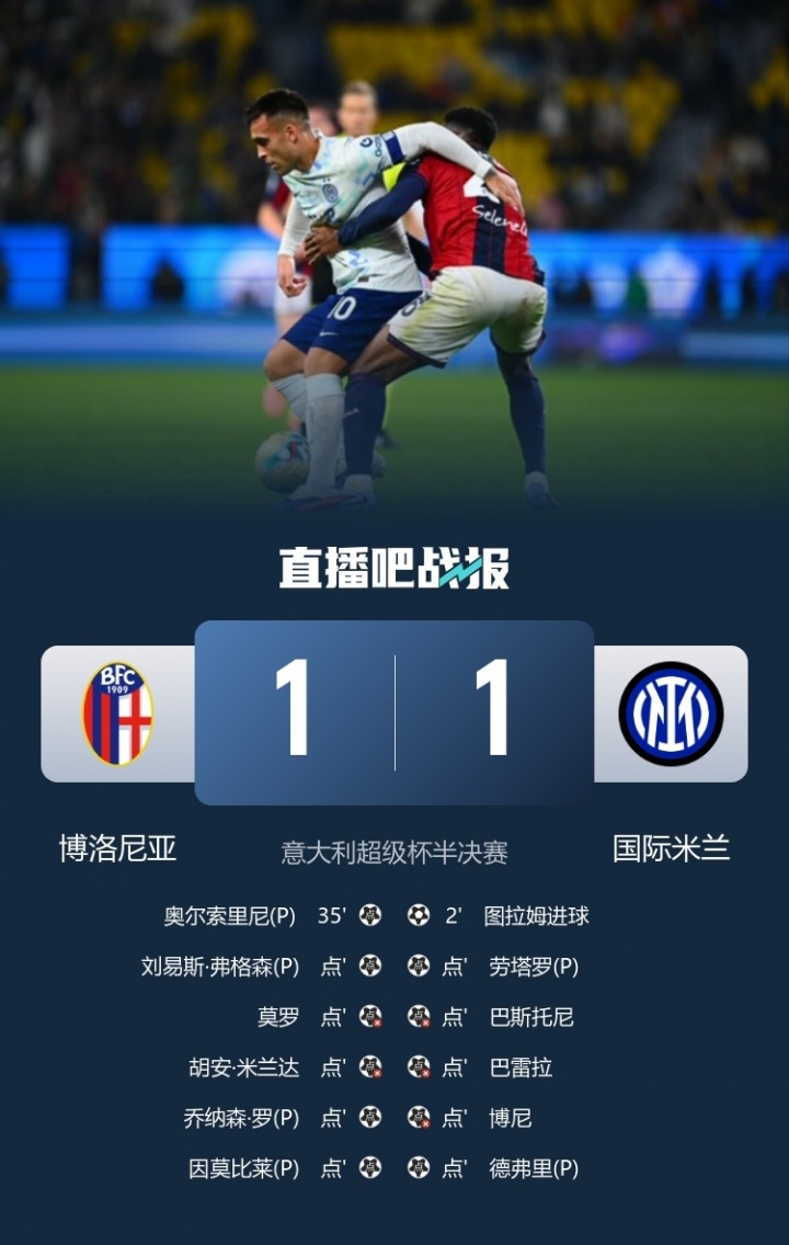 直播吧12月20日讯 意大利超级杯半决赛,博洛尼亚对阵国际米兰,比赛在沙特国王大学体育场进行。上半场,小图拉姆2分钟闪击建功,比塞克手球送点,奥尔索里尼点射建功,贝纳德斯基伤退。易边再战,VAR取消国米点球。最终常规时间国米1-1博洛尼亚直接进入点球大战。点球大战国米巴斯托尼、巴雷拉、博尼失点。最终博洛尼亚常规时间1-1,点球大战3-2国米晋级决赛,将对阵那不勒斯。