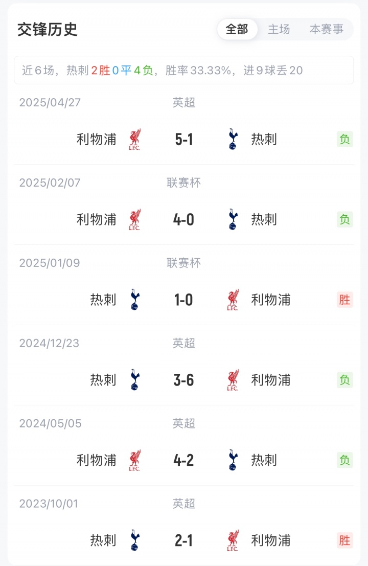热刺联赛6胜4平6负积22分,近7轮仅1胜;利物浦联赛8胜2平6负积26分,各项赛事已连续5场不败。热刺对阵利物浦已遭遇两连败。