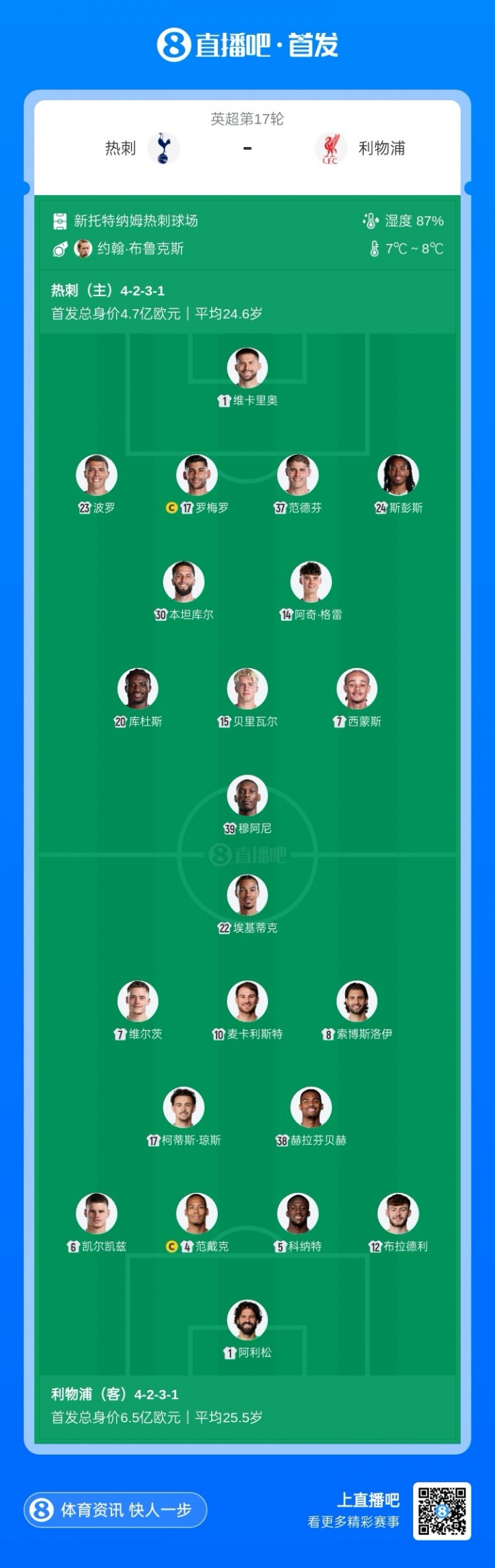 直播吧12月21日讯 英超第17轮,热刺主场迎战利物浦,赛前双方首发公布。【利物浦方面,索博斯洛伊、维尔茨先发,因乔·戈麦斯受伤,布拉德利入选首发,弗林蓬、伊萨克坐镇替补。萨拉赫因参加非洲杯最多可能缺席1个月。热刺方面,贝里瓦尔顶替里沙利松首发。】