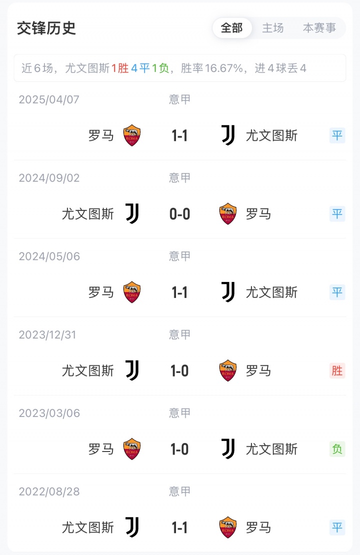 尤文联赛7胜5平3负积26分暂位意甲第5,各项赛事已获两连胜;罗马联赛10胜5负积30分暂居意甲第4,近3轮仅1胜。尤文对阵罗马已经3连平,近4场1胜3平。