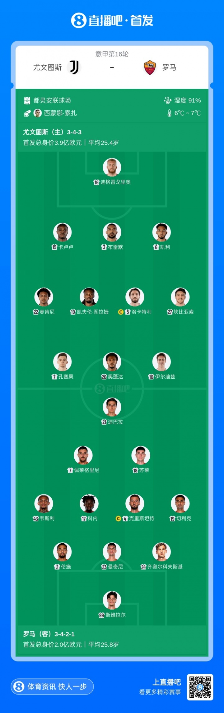 罗马首发:99-斯维拉尔、2-伦施、19-切利克、23-曼奇尼、24-齐奥尔科夫斯基、43-韦斯利、4-克里斯坦特、7-佩莱格里尼、17-科内、18-苏莱、21-迪巴拉