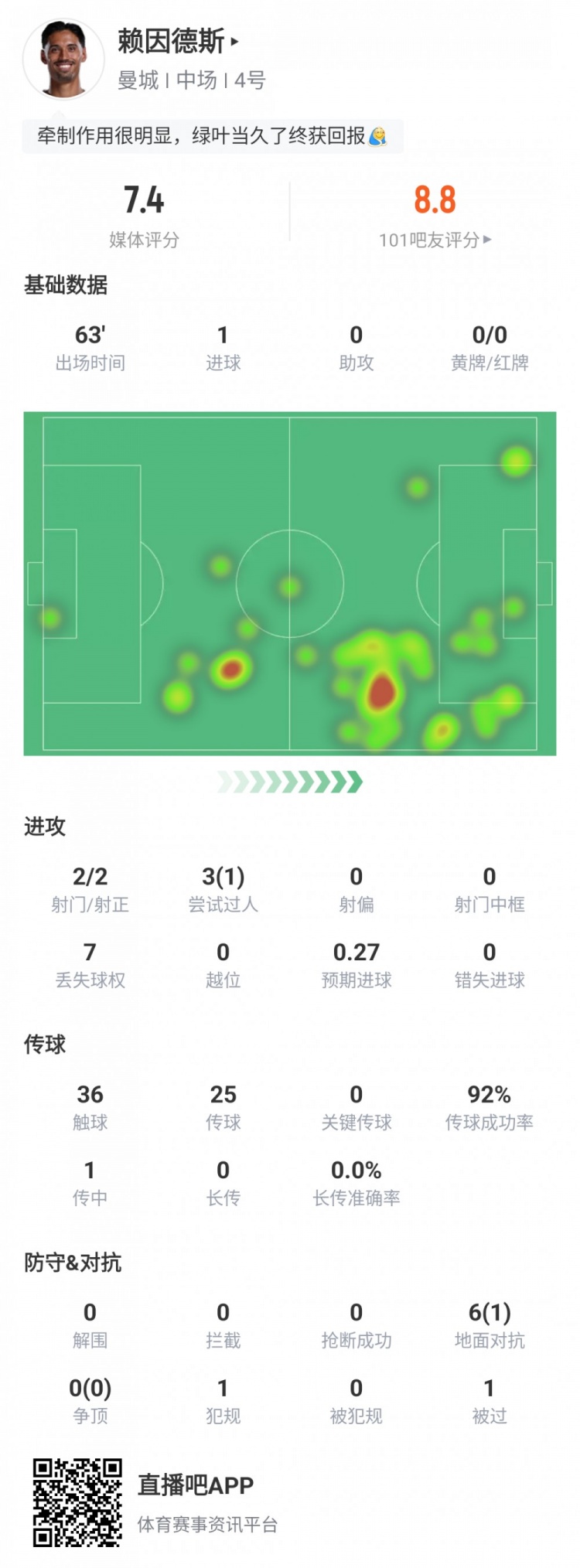 触球36次,传球25次,传球成功率92%,传中1次