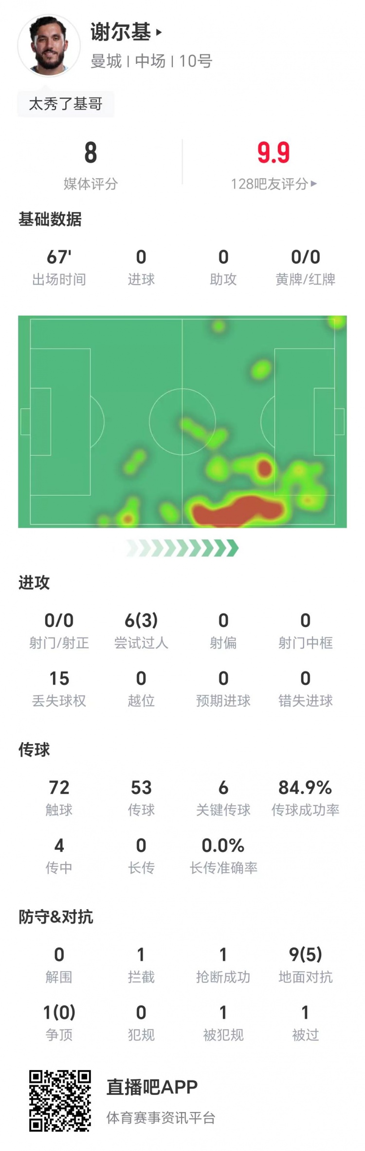技术统计数据显示,谢尔基本场比赛6次过人3次成功,6次关键传球,1次拦截,1次抢断,9次地面对抗成功5次,获评8分。