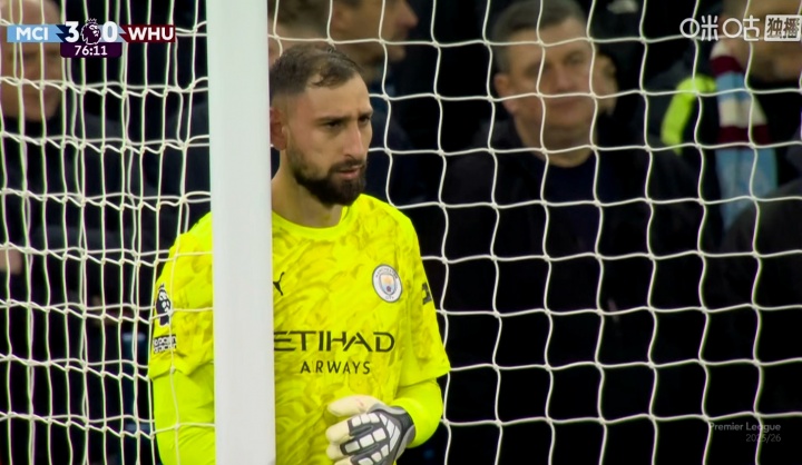 比赛第77分钟,曼城门将多纳鲁马用脸挡出了萨默维尔近距离的打门,随后在防守定位球时特写给到多纳鲁马,他的面部明显出现了被球击中的印记。