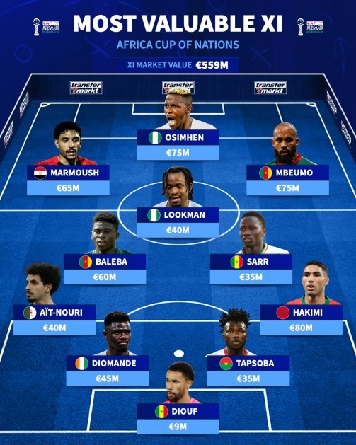 直播吧12月21日讯 非洲杯开赛在即,德国转会市场评选出本届赛事最贵阵,阿什拉夫、奥斯梅恩、马尔穆什、姆伯莫领衔,无萨拉赫。