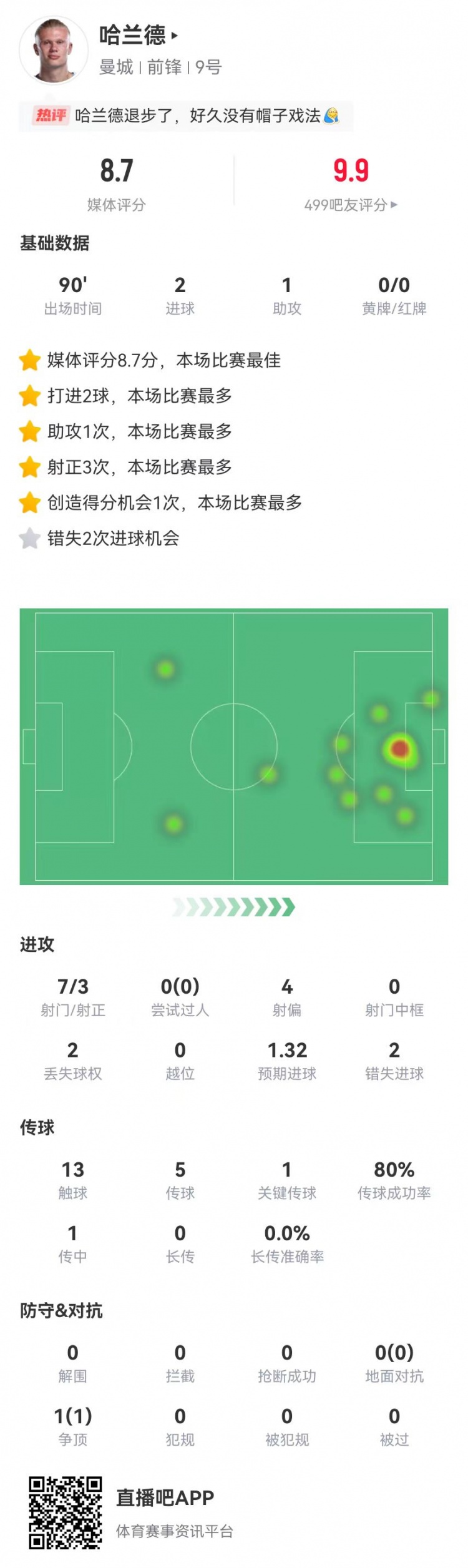 直播吧12月21日讯 曼城在本轮英超对阵西汉姆联,哈兰德本场数据如下: