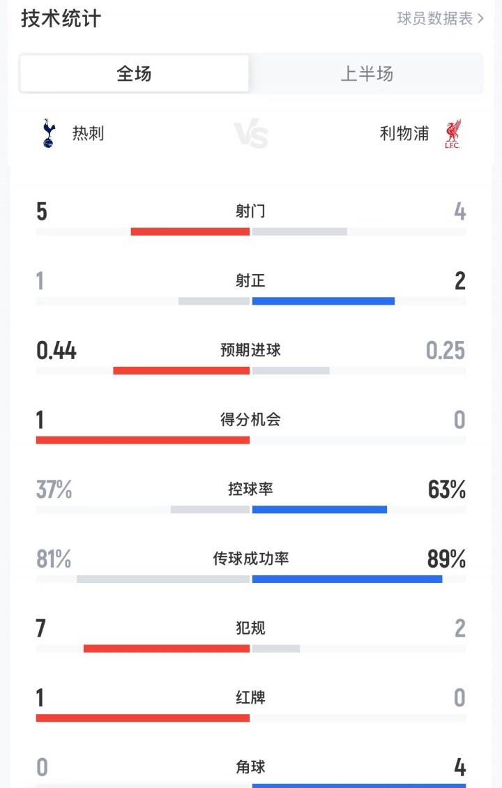 热刺半场5射1正,预期进球0.44,7次犯规1张红牌。利物浦4射2正,预期进球0.25,犯规仅2次。