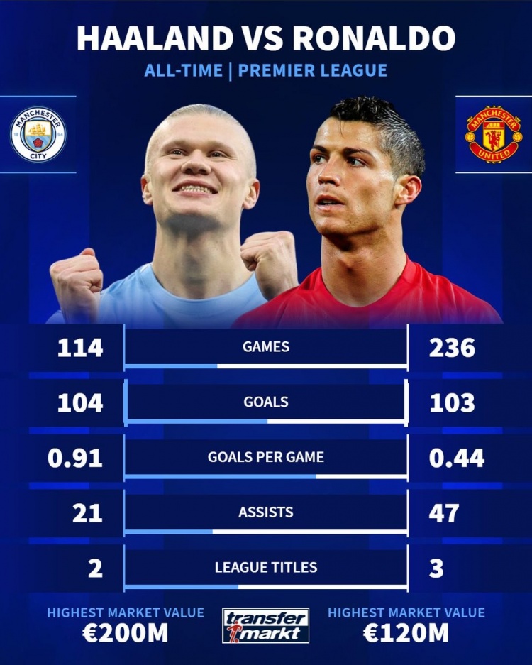 直播吧12月21日讯 曼城在本轮英超3-0完胜西汉姆,哈兰德贡献2射1传,也超越了C罗的英超进球数。《转会市场》也对比了两人英超关键数据。