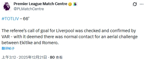 英超官方对此判罚做出解释:“利物浦进球判罚经VAR核查确认有效,埃基蒂克与罗梅罗在争抢空中球时属于正常身体接触。”