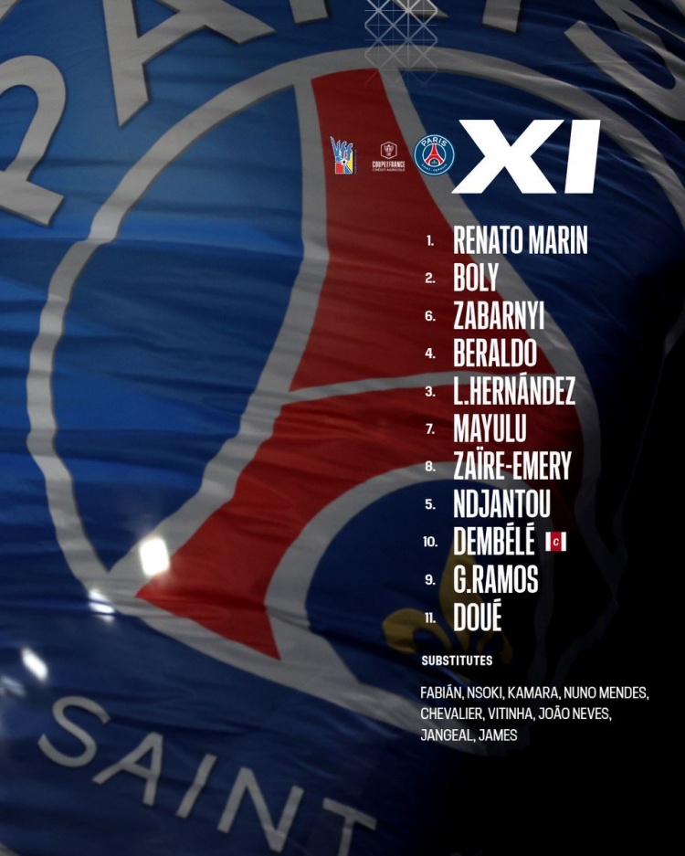 巴黎替补:法比安·鲁伊斯、诺亚·恩索基、诺哈姆·卡马拉、努诺·门德斯、舍瓦利耶、维蒂尼亚、若昂·内维斯、马蒂斯·让热尔、马丁·詹姆斯