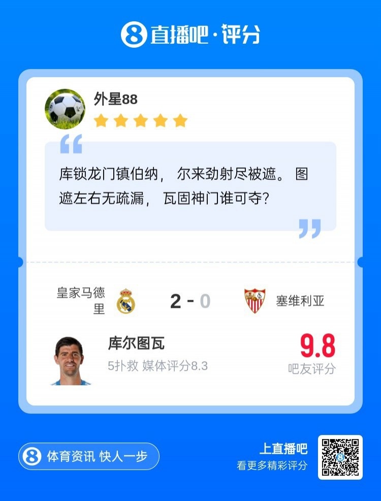 皇马2025年最后一战2-0击败塞维利亚,本场比赛库尔图瓦继续出色表现,全场奉献5次扑救力保城门不失,帮助球队主场全取三分。赛后,库尔图瓦获得了8.3的评分。