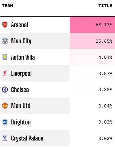 数据机构Opta的超级计算机给出了最新的英超夺冠概率,阿森纳68.17%依旧领跑,曼城25.65%,维拉4.84%,利物浦、切尔西、曼联等5队则不到1%,其余球队夺冠概率为0。