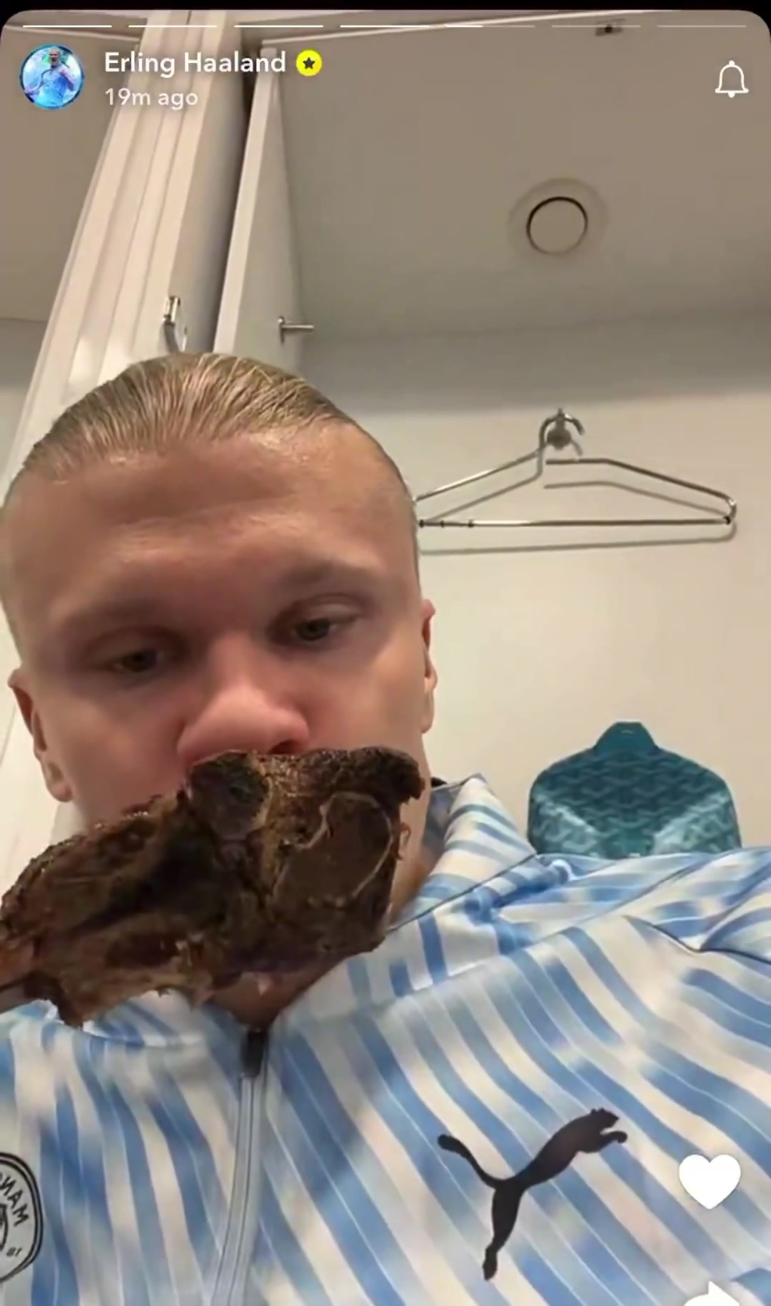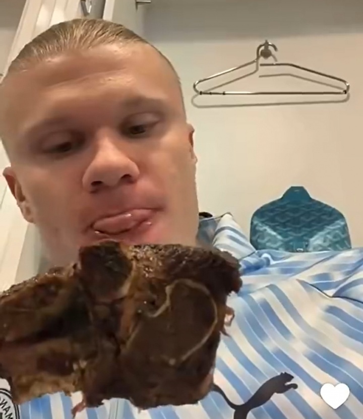 哈兰德在社交媒体上晒出了一段视频,视频中,他坐在更衣室里,手拿着一块带骨牛排对着镜头一顿猛啃,边吃还舔嘴,看得出他吃得很香。