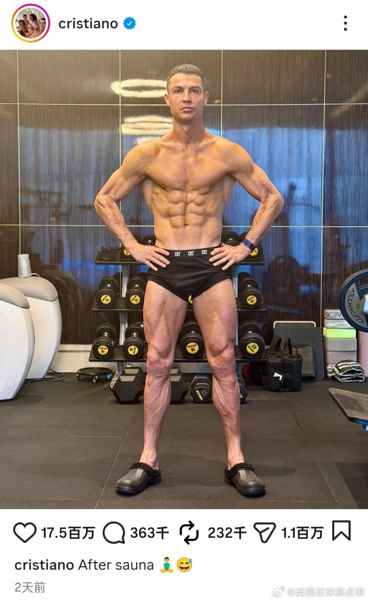 C罗的身材照片发布不到两天已经获得1750万赞,36万评论🤯