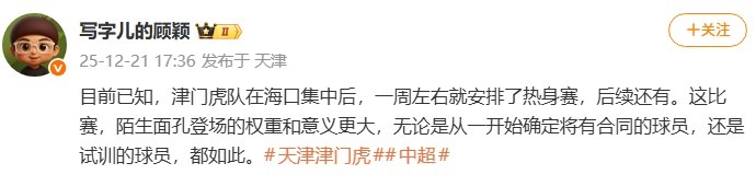 直播吧12月21日讯 今日记者顾颖社媒发文谈津门虎冬训情况,透露津门虎队在海口安排热身赛。