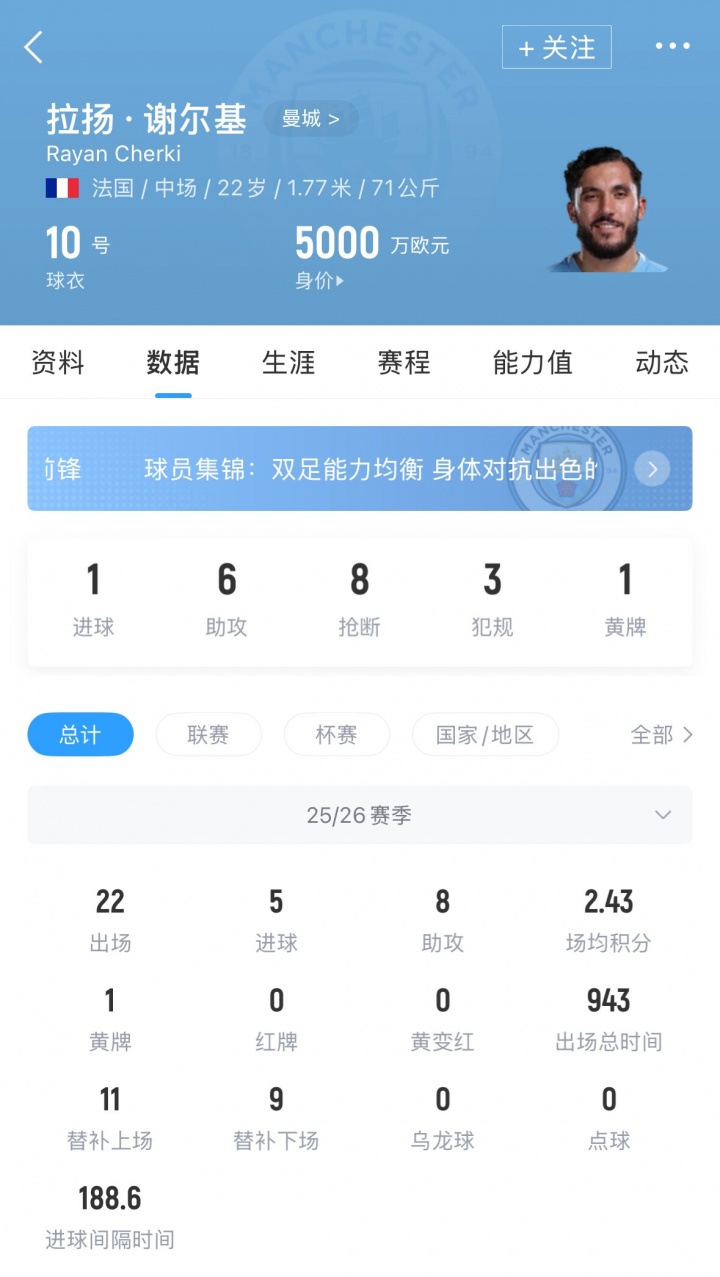 本赛季谢尔基共为曼城出战22场,贡献5球8助攻,球员目前身价5000万欧。