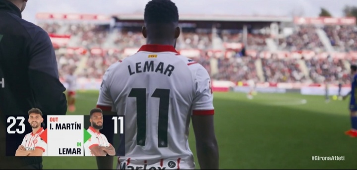 第71分钟,赫罗纳战术调整,换上马竞旧将勒马尔。