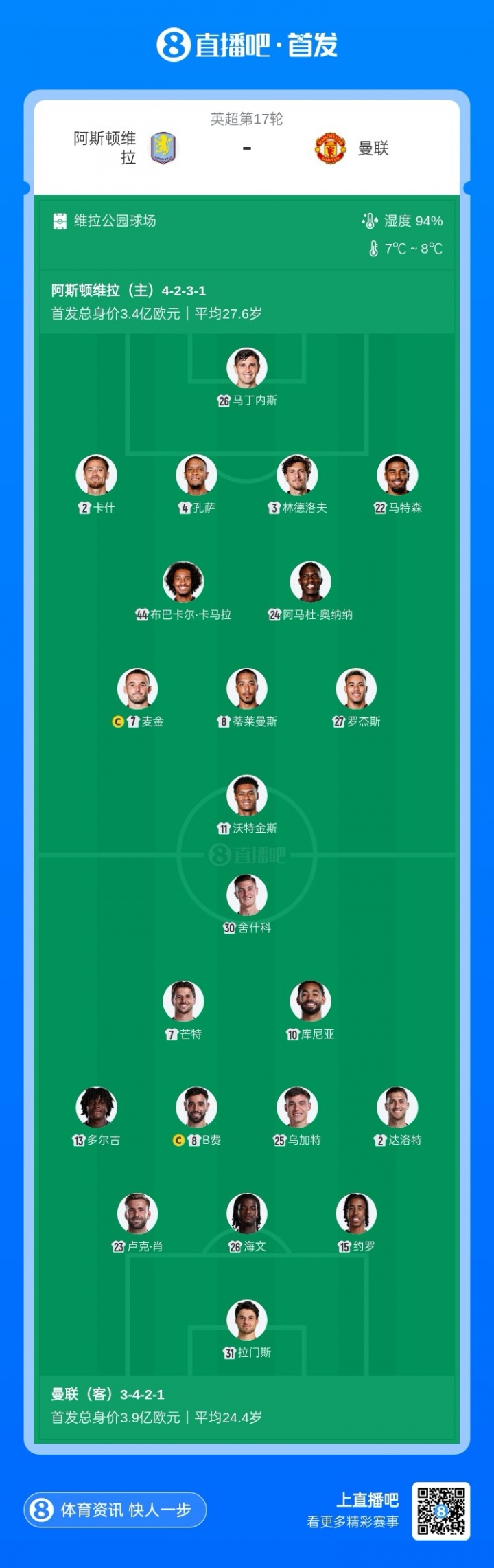 阿斯顿维拉首发:23-马丁内斯、3-林德洛夫、4-孔萨、2-卡什、22-马特森、24-阿马杜·奥纳纳、8-蒂莱曼斯、27-罗杰斯、44-卡马拉、7-麦金、11-沃特金斯