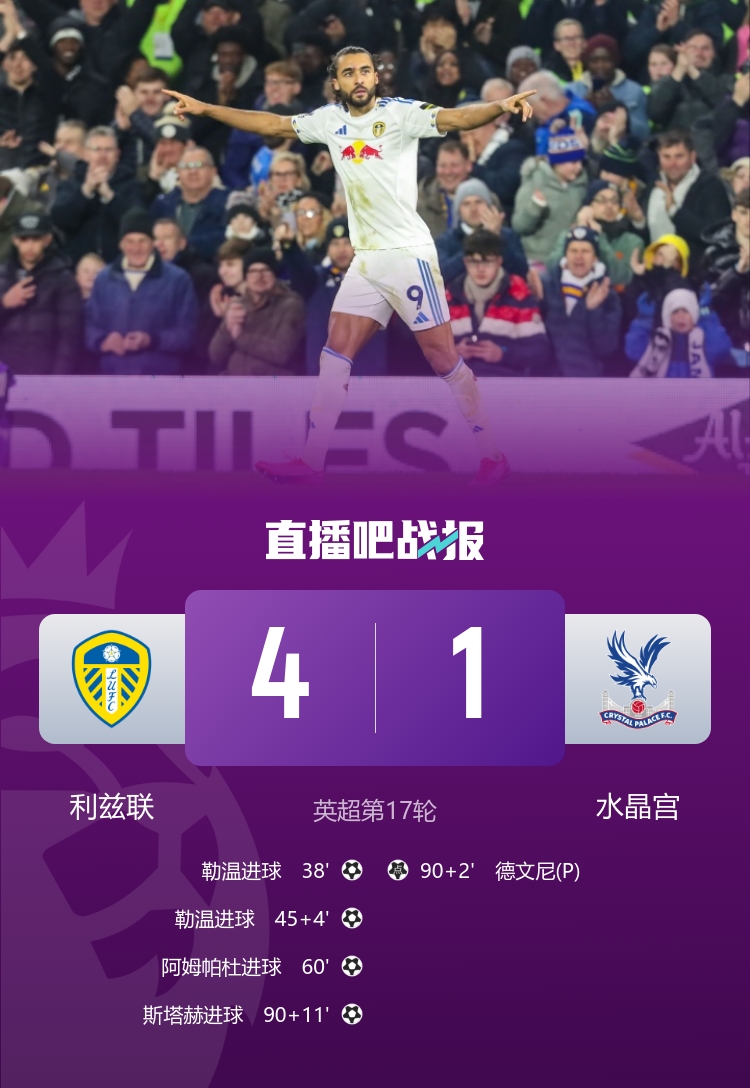 直播吧12月21日讯 北京时间12月21日凌晨4时整,2025-26赛季英超第17轮在埃兰路球场展开角逐,利兹联主场迎战水晶宫。上半场勒温梅开二度+连续5场破门,下半场阿姆帕杜扩大比分,德文尼点射扳回一城,斯塔赫任意球破门。最终利兹联主场4-1战胜水晶宫,利兹联联赛4轮不败领先降级区6分,水晶宫遭遇两连败下滑至第8。