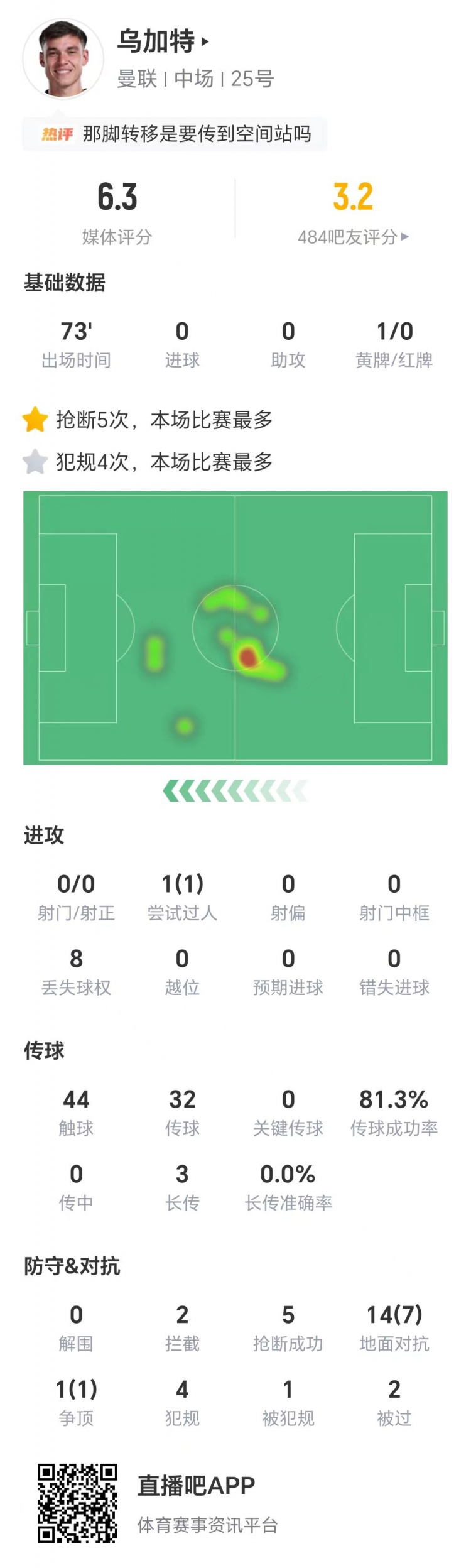 赛后技术统计数据显示,乌加特本场比赛两次拦截,5次抢断,14次地面对抗成功7次,无关键传球,获评6.3分。