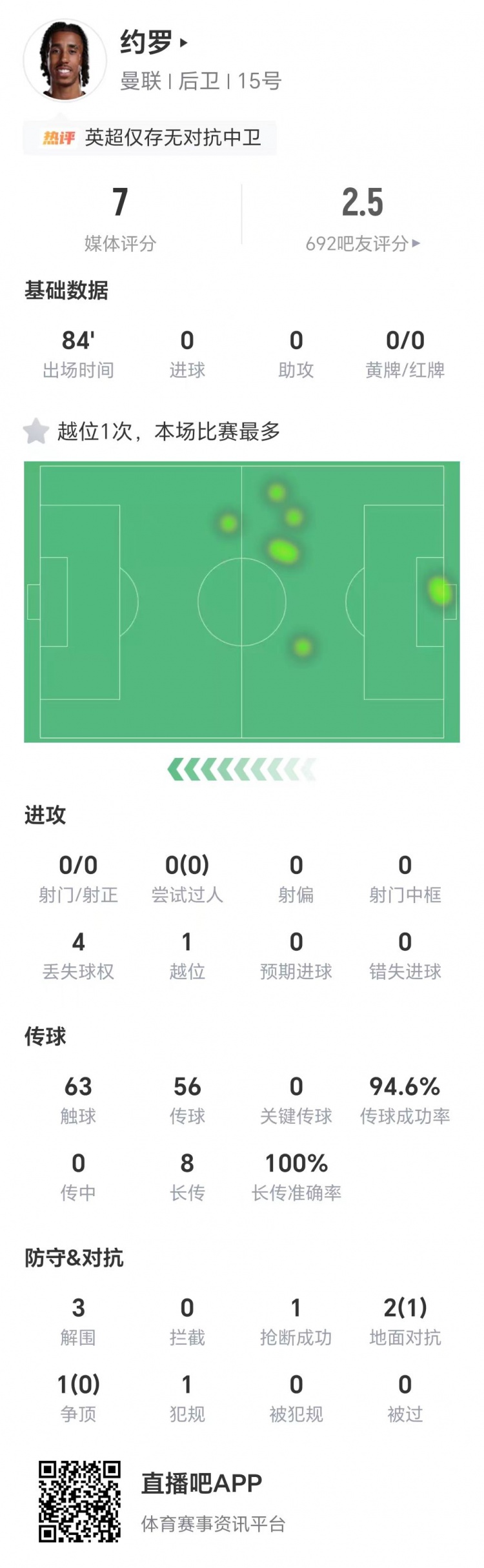 赛后技术统计数据显示,约罗本场比赛3次解围,1次抢断,两次地面对抗成功1次,获评7分。