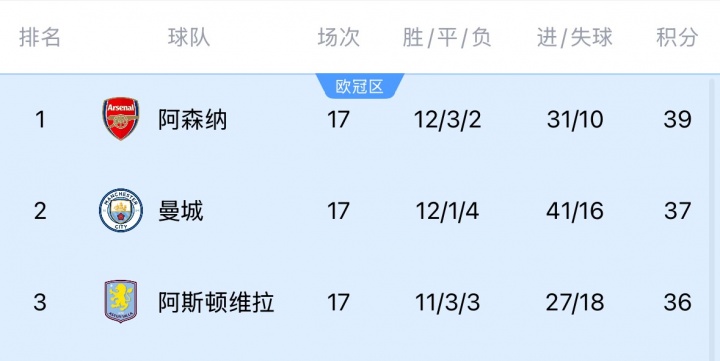 阿森纳目前在英超只领先曼城2分,维拉3分,面对这两支状态火热的竞争者,阿森纳也不敢说坐稳了榜首之位。