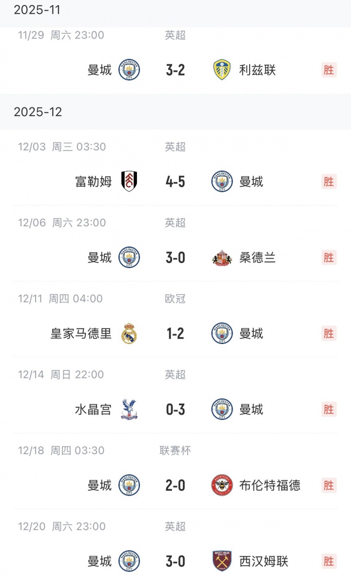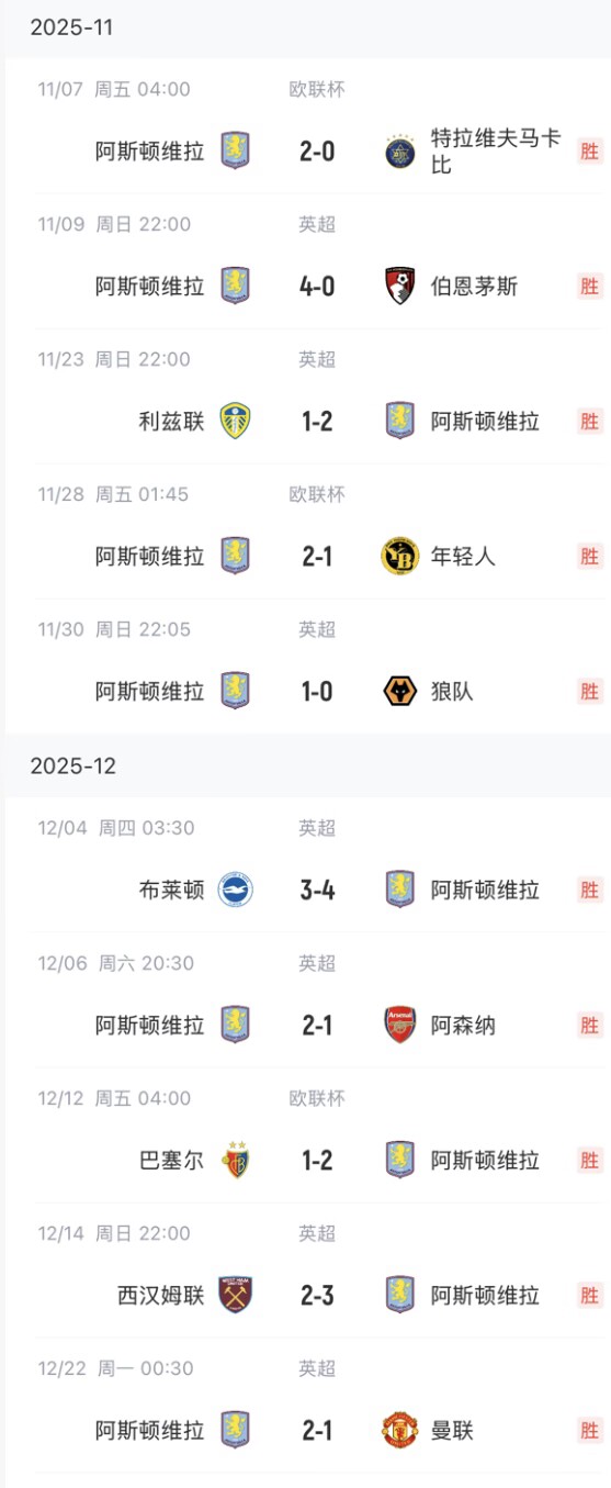 直播吧12月22日讯 英超第17轮,维拉主场2-1曼联,各项赛事取得10连胜;同样第17轮,曼城3-0西汉姆,各项赛事取得7连胜。