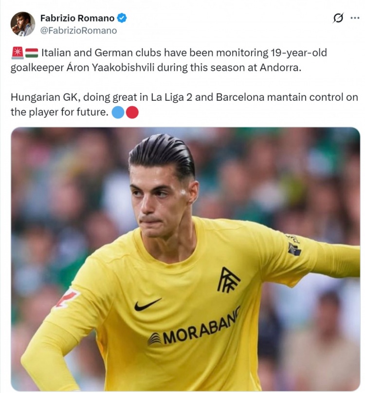 罗马诺指出,意大利和德国俱乐部关注19岁门将雅科比什维利,这位匈牙利门将本赛季在安道尔FC表现出色,而巴萨仍保留对他未来的控制权。