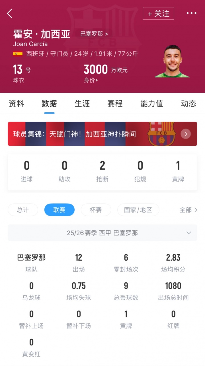 本赛季霍安·加西亚代表巴萨联赛出战12场,取得6场零封,他在场上时,球队场均积分高达2.83分,是巴萨目前能够领跑积分榜的关键先生。