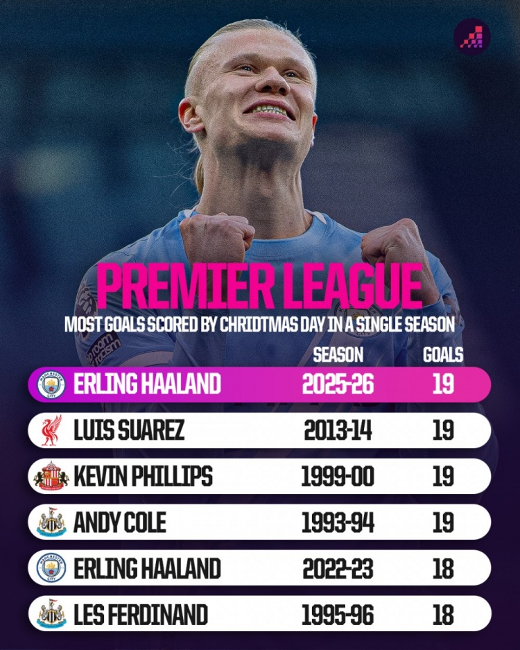 直播吧12月22日讯 英超17轮过后,目前曼城前锋哈兰德以19球领跑射手榜,领先第2名伊戈尔多达8球。据Opta数据统计,在圣诞节前英超单赛季历史射手榜中,哈兰德、苏亚雷斯、安迪·科尔、凯文·菲利普斯各19球排名第1。