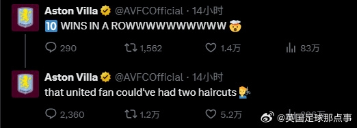 【贴脸开大】维拉官推:10连胜!那位曼联球迷可以剪两次头发了
