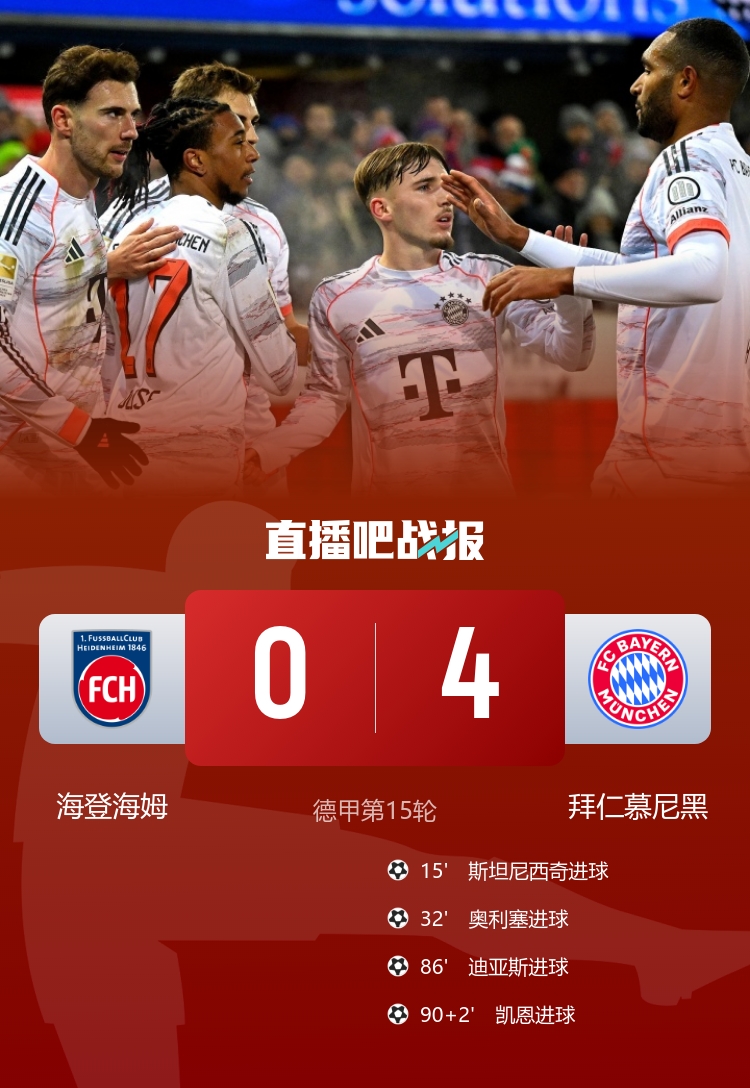 直播吧12月22日讯 北京时间12月22日00:30,德甲第15轮拜仁挑战海登海姆的比赛在福伊特竞技场进行,上半场塔助攻斯坦尼西奇头球破门,奥利塞抽射扩大比分,下半场凯恩低射中柱,斯基默头球中楣,迪亚斯头球锁定胜局,凯恩补时建功,最终拜仁4-0海登海姆9分领跑年度收官。