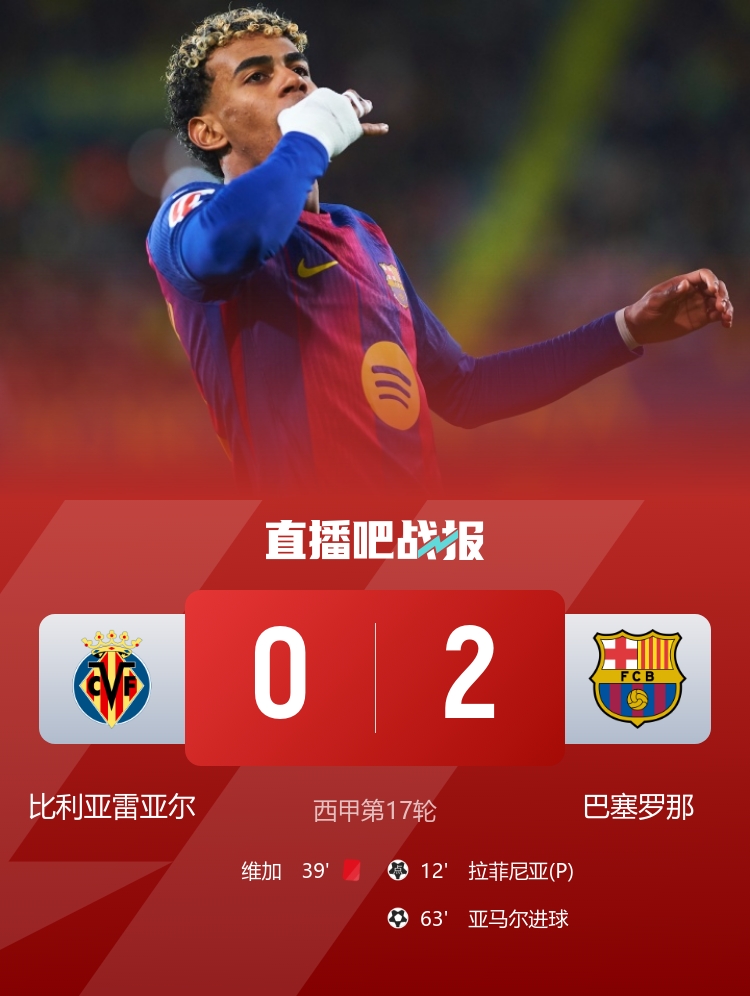 直播吧12月22日讯 北京时间12月21日23点15分,西甲第17轮,比利亚雷亚尔在主场陶瓷球场迎战巴塞罗那。上半场,拉菲尼亚造点后亲自主罚点球命中,随后他又远射击中横梁,维加染红。下半场,德容助攻亚马尔破门。最终巴塞罗那2-0比利亚雷亚尔。本场比赛过后,巴塞罗那积46分仍居榜首,以4分领跑,比利亚雷亚尔少赛两场积35分,排在第四。