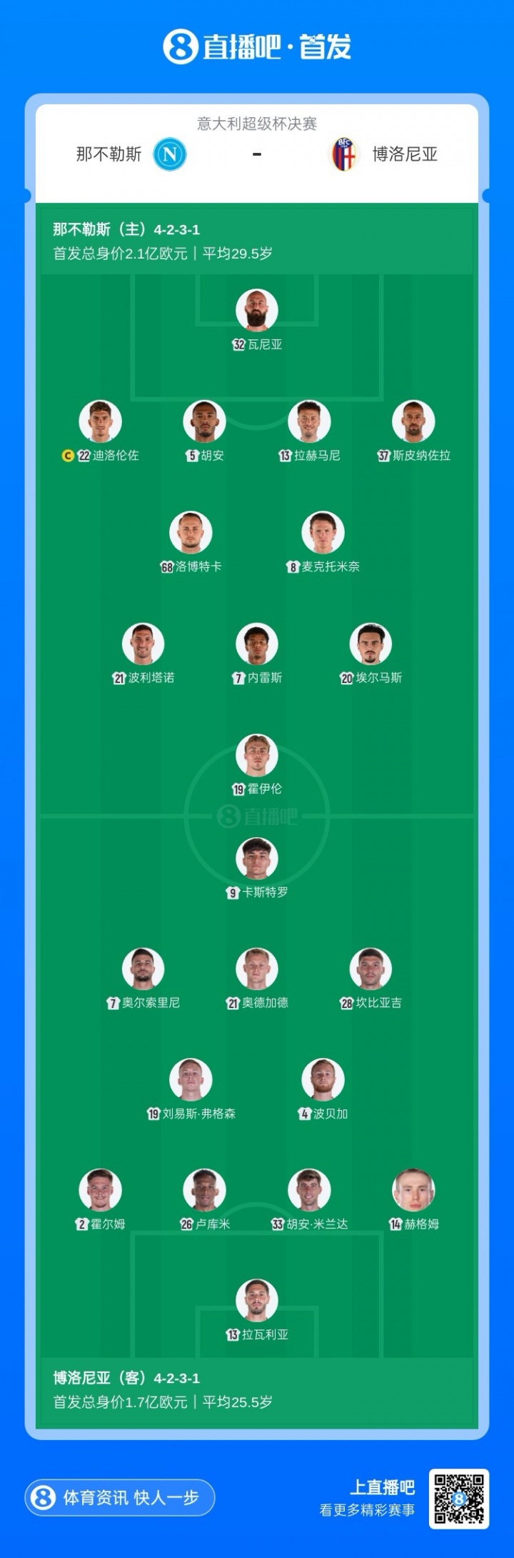 直播吧12月23日讯 意大利超级杯决赛,那不勒斯vs博洛尼亚比赛即将打响。赛前首发出炉。