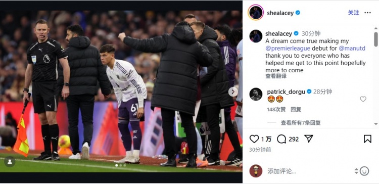 >莱西发文:在曼联完成英超首秀是梦想成真,希望未来有更多机会