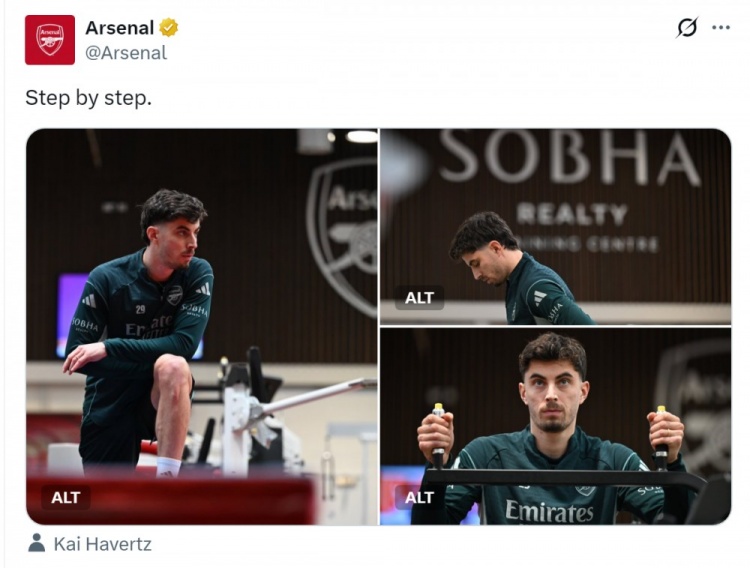 阿森纳官方社媒晒出哈弗茨在健身房内进行康复训练的照片,配文:“一步一步。”
