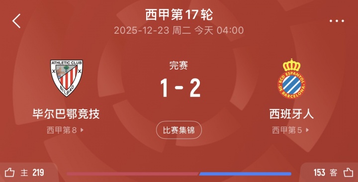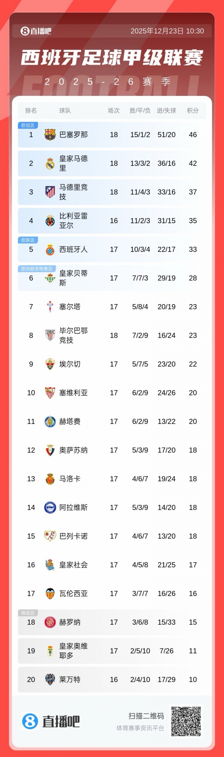 直播吧12月23日讯 西班牙人2-1客胜毕巴,豪取西甲五连胜,球队在积分榜上已经攀升至第5位,距离欧冠区的比利亚雷亚尔只有2分之遥。
