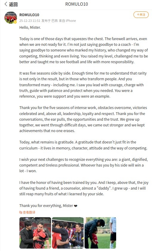 希望您的下一个挑战能够认识到,您是一位专业的足球人,伟大、有能、勤勉是您身上的标签。任何与您共事的人都会受益匪浅,我也正是其中之一。