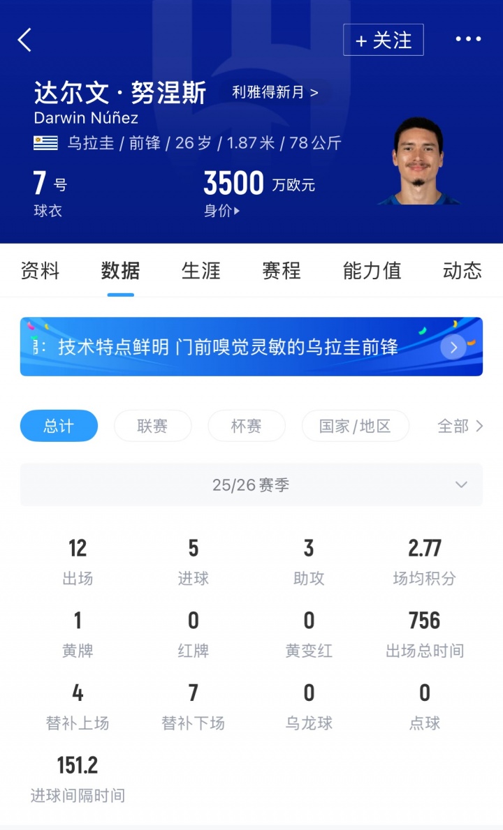 26岁的努涅斯今夏从利物浦转会新月,转会费5300万欧。加盟至今努涅斯沙特联6场4球2助,亚冠精英4场1球1助,算上沙王冠各项赛事12场5球3助。