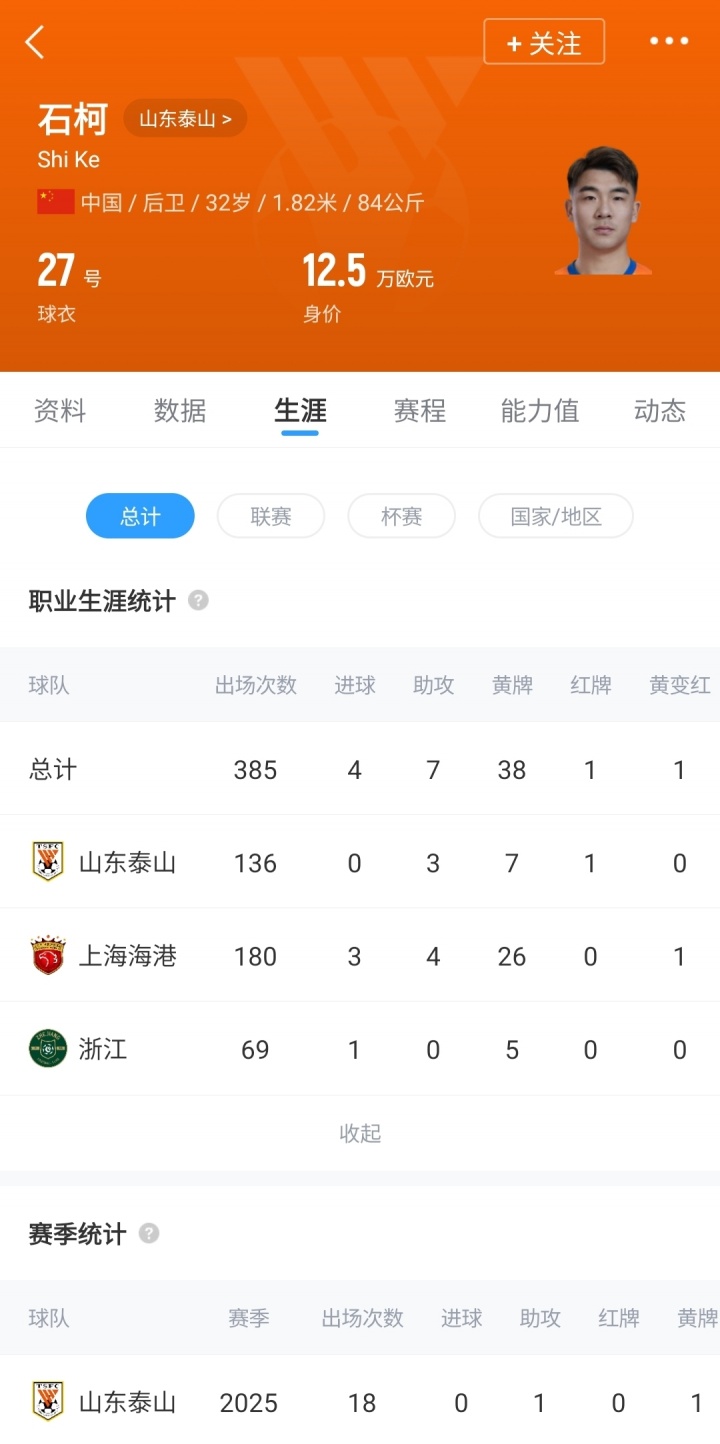石柯,现年32岁,场上司职中卫,上赛季为山东泰山出战18场比赛,贡献1次助攻。
