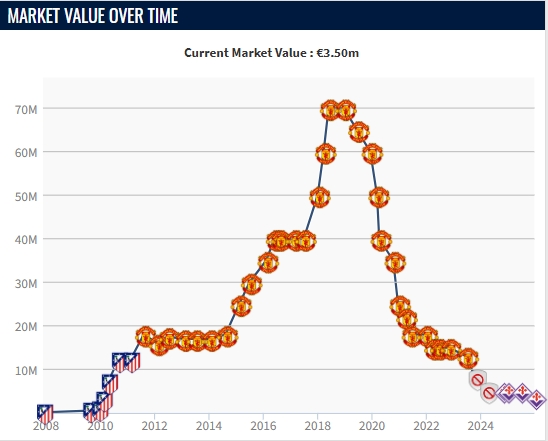 德赫亚上次身价低于350万欧还是在2010年1月,当时的他还效力马竞。