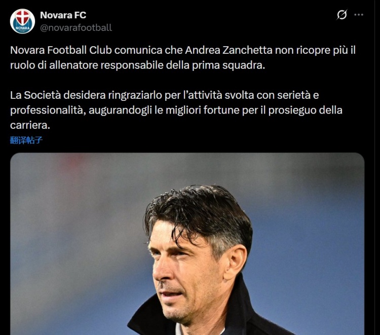 “诺瓦拉足球俱乐部发布通告:安德烈·赞切塔不再担任一线队主教练。”