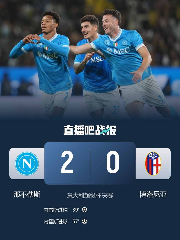 直播吧12月23日讯 意大利超级杯决赛,那不勒斯对阵博洛尼亚,比赛在沙特国王大学体育场进行。上半场,斯皮纳佐拉错失良机,内雷斯世界波先拔头筹。易边再战,内雷斯再进一球。最终那不勒斯2-0博洛尼亚,队史第三次问鼎意超杯。