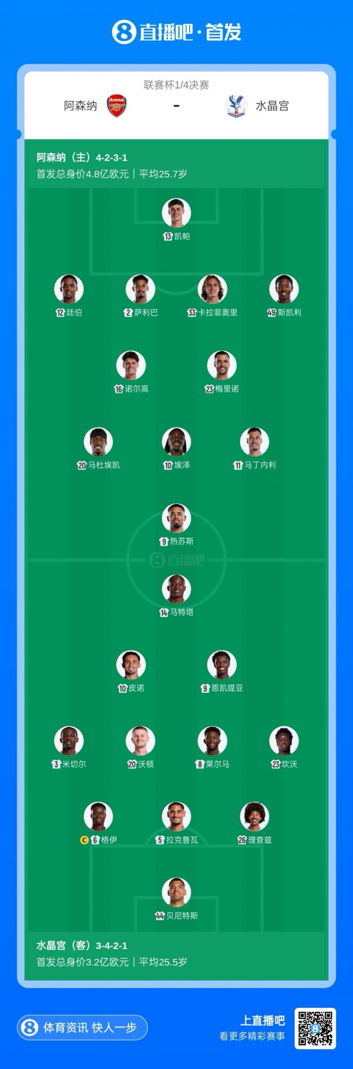 直播吧12月24日讯 联赛杯1/4决赛,阿森纳主场迎战水晶宫,赛前双方首发公布。【阿森纳方面,卡拉菲奥里与萨利巴搭档中后卫,热苏斯则自345天以来首次获得首发机会。】