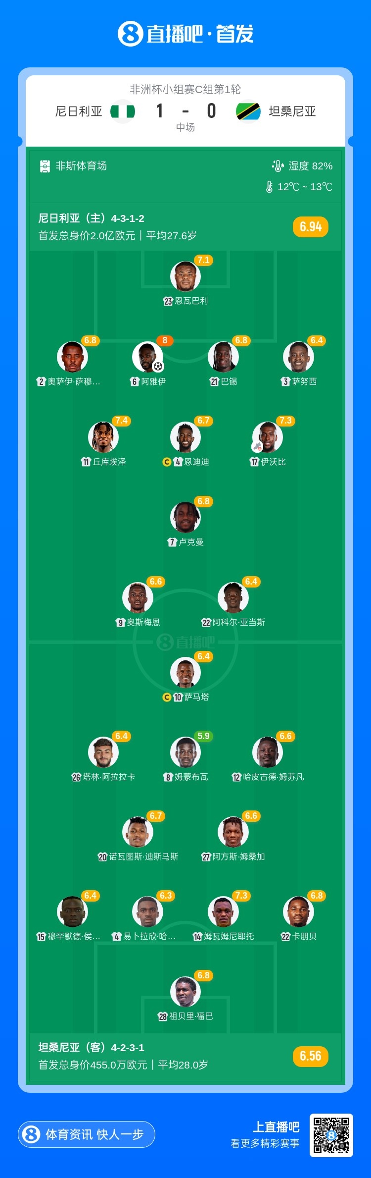 直播吧12月24日讯 北京时间1:30,非洲杯小组赛C组第1轮尼日利亚vs坦桑尼亚。上半场,阿科尔·亚当斯中横梁;奥斯梅恩小角度空门被门线解围;阿雅伊头球打破僵局!半场结束,尼日利亚暂1-0领先坦桑尼亚。