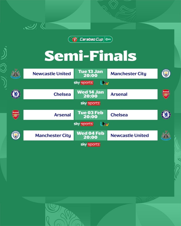 直播吧12月24日讯 联赛杯1/4决赛,阿森纳1-1点球战8-7水晶宫晋级,将在半决赛对阵切尔西。联赛杯半决赛,切尔西、纽卡先主后客。