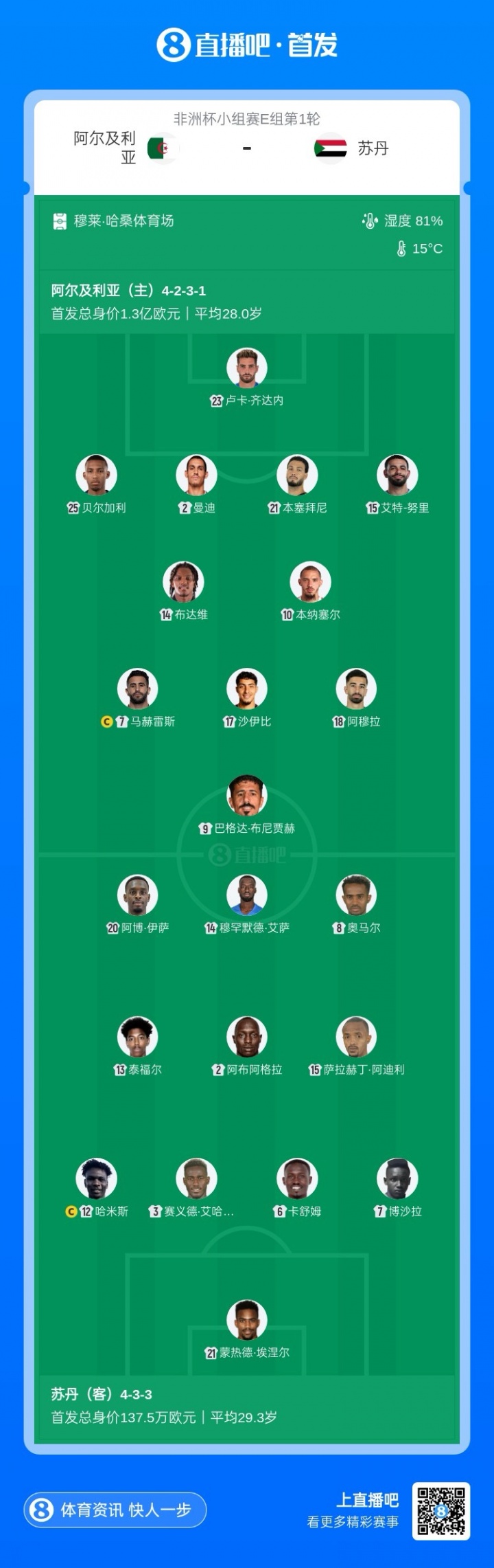 直播吧12月24日讯 北京时间12月24日23:00,非洲杯小组赛E组第1轮,阿尔及利亚vs苏丹。赛前首发公布。