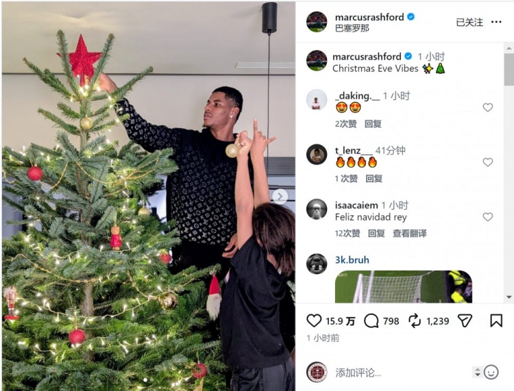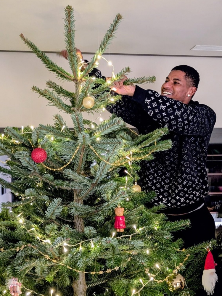 圣诞节来临,拉什福德与家人共度节日,他在社交媒体上晒出在家中装饰圣诞树的照片,配文:“圣诞夜氛围。”