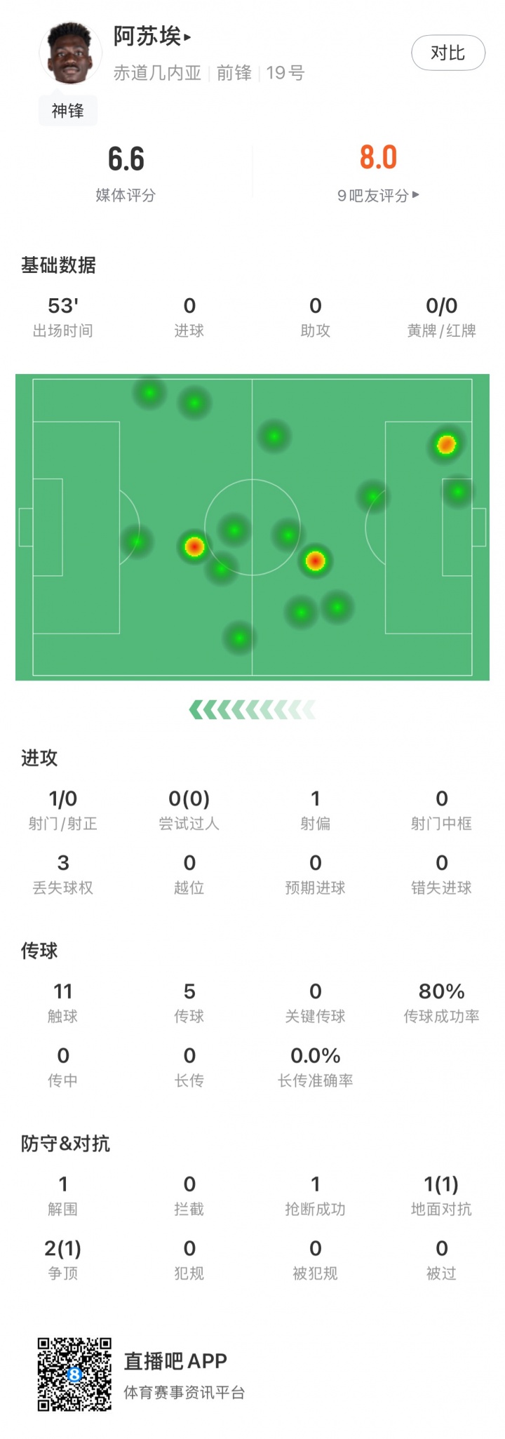 阿苏埃53分钟1次射门0射正,11次触球5次传球,3次丢失球权。1次解围、1次成功抢断,1次地面对抗成功。