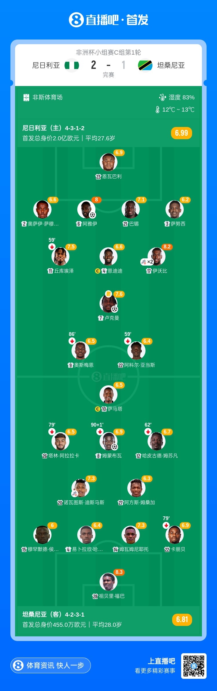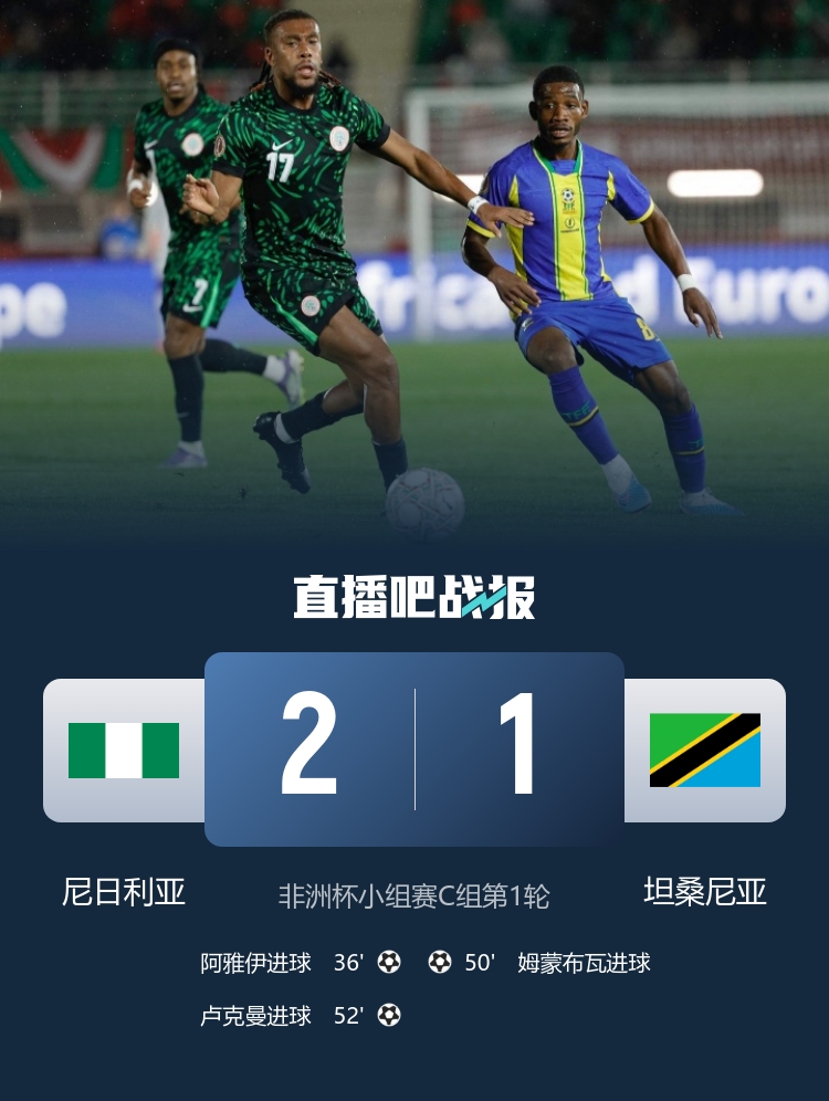 直播吧12月24日讯 北京时间1:30,非洲杯小组赛C组第1轮尼日利亚vs坦桑尼亚。上半场,阿科尔·亚当斯中横梁;奥斯梅恩小角度空门被门线解围;伊沃比助攻,阿雅伊头球打破僵局!下半场,姆蒙布瓦帮助坦桑尼亚扳平比分,但2分钟后伊沃比再次助攻,卢克曼远射破门!最终,尼日利亚2-1击败坦桑尼亚,取得本届非洲杯开门红。